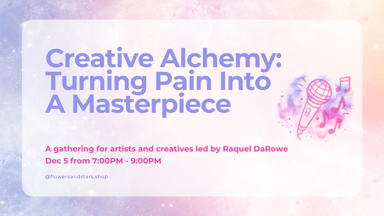 A gathering for artists and creatives: poets, painters, songwriters, singers, storytellers, photographers, musicians, writers, dancers, and artists of all forms to share their masterpiece of alchemizing pain and suffering into art and something beautiful.