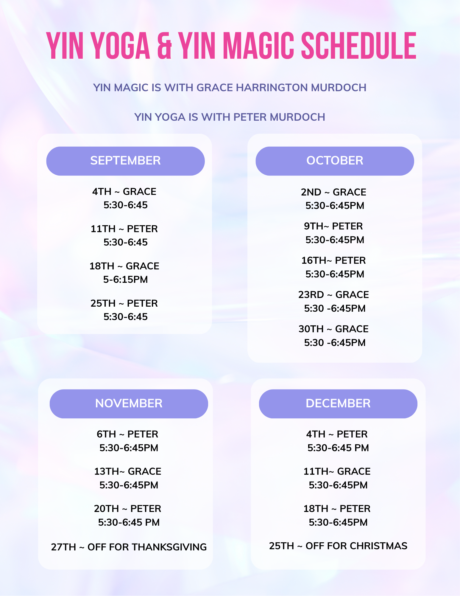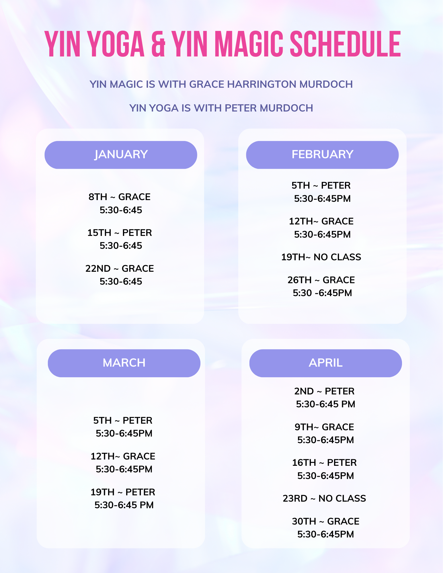 Thank you to everyone who filled out our survey to share which day and time worked best. Thursday evenings came out on top, so we’re excited to officially welcome you to Yin Magic & Yin Yoga on Thursdays at 5:30 PM!